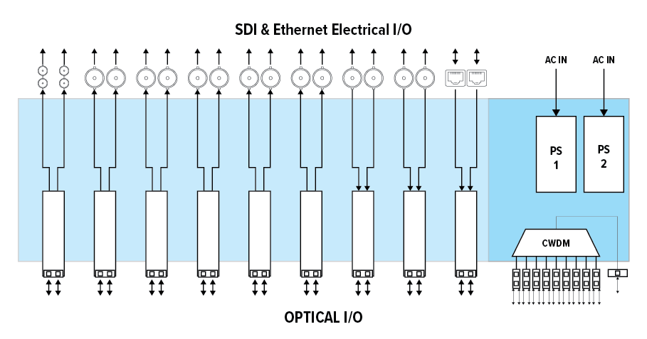 Ideal for use in OB vans where space is limited and high density is a necessity. With dual hot swapable power supplies, there is peace of mind with power redundancy and no need for cumbersome external power supplies.