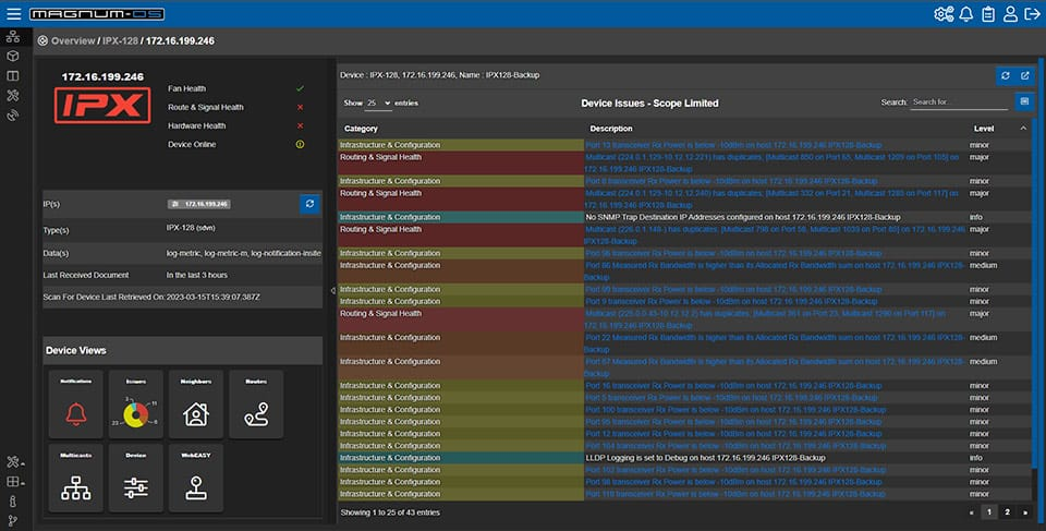 MAGNUM OS enables operators through the Evertz VistaLINK® PRO technology to monitor and manage complex systems more effectively than before. MAGNUM OS through the MAGNUM-NMS modules offers a wide range of functionality including web access, fault management, configuration management, alarm/event notification, report and log management, intelligent correlation and root cause analysis, user-defined graphic views/dashboards.