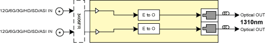 Dual-channel SFP optical transmitter with standard 1310nm lasers. Reclocked with support for 12G, 3G, HD, SD and ASI.