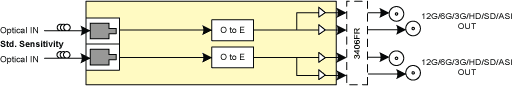 Dual-channel SFP optical receiver. Reclocked with support for 12G, 3G, HD, SD and ASI. Dual electrical outputs per optical input.