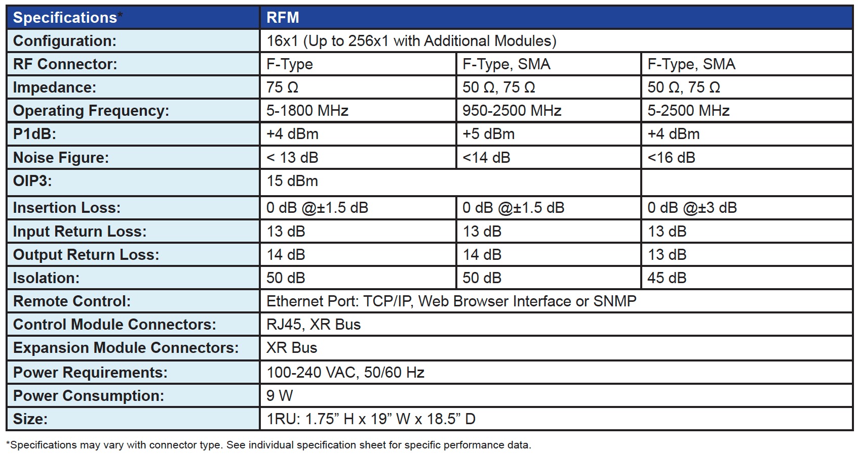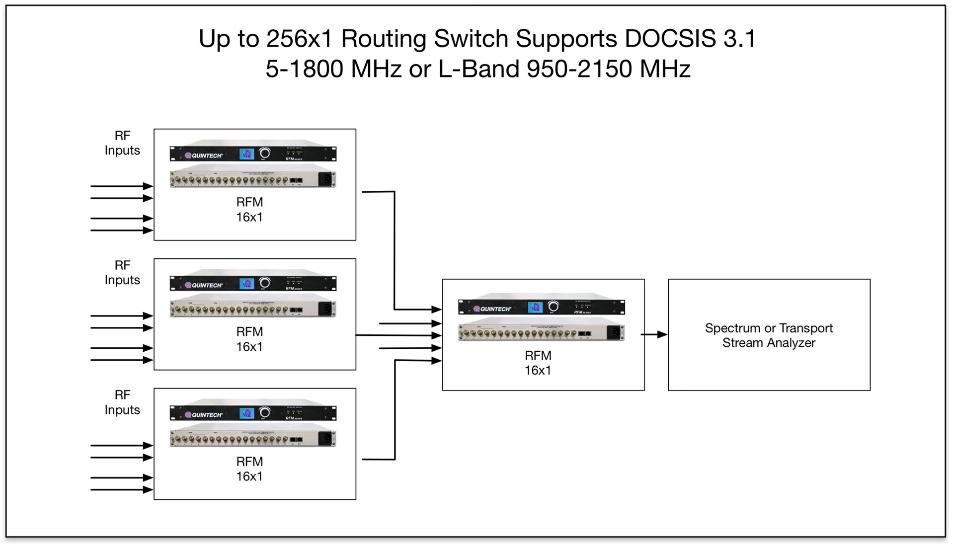 The RFM 2500 is a routing switch that transparently routes many source or destination signals to a common port. Its compact design provides 16x1 ports in a 1RU chassis and can be cascaded using multiple modules to route up to 256 source ports to a common port. The RFM 2500 is used for centralized test and measurement applications and monitoring a large number of RF signals.