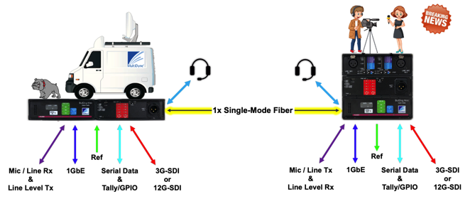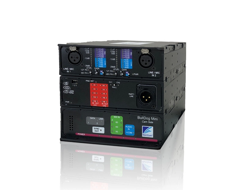 The BullDog Mini is a compact, rugged field fiber transport device designed from the ground up to meet the needs of single camera and booth kit setups. The BullDog Mini can transport bidirectional 3G-SDI, IFB, and two MIC/line audios as well as, two serial data channels – all over a single strand of single-mode fiber. Optical connector options include SMPTE, opticalCon, or standard ST. With options for remote power via SMPTE hybrid fiber cable and battery operation, the BullDog Mini is ready for any location regardless of available power.